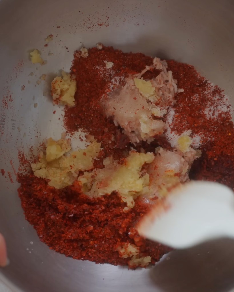 - Add 1/4 cup of the prepared Kimchi Seasoning to the bowl.