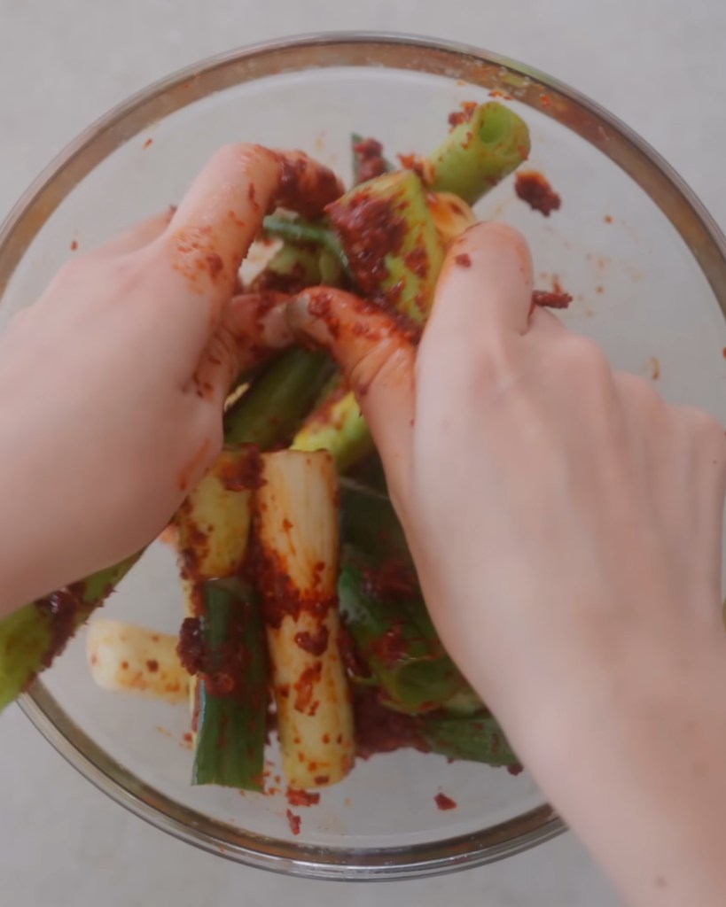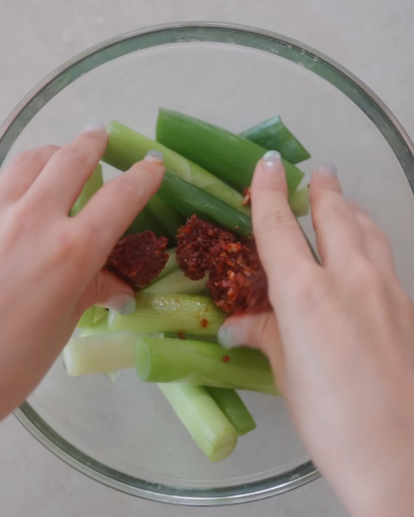 - Gently mix and massage the seasoning into the green onions until they are well coated.