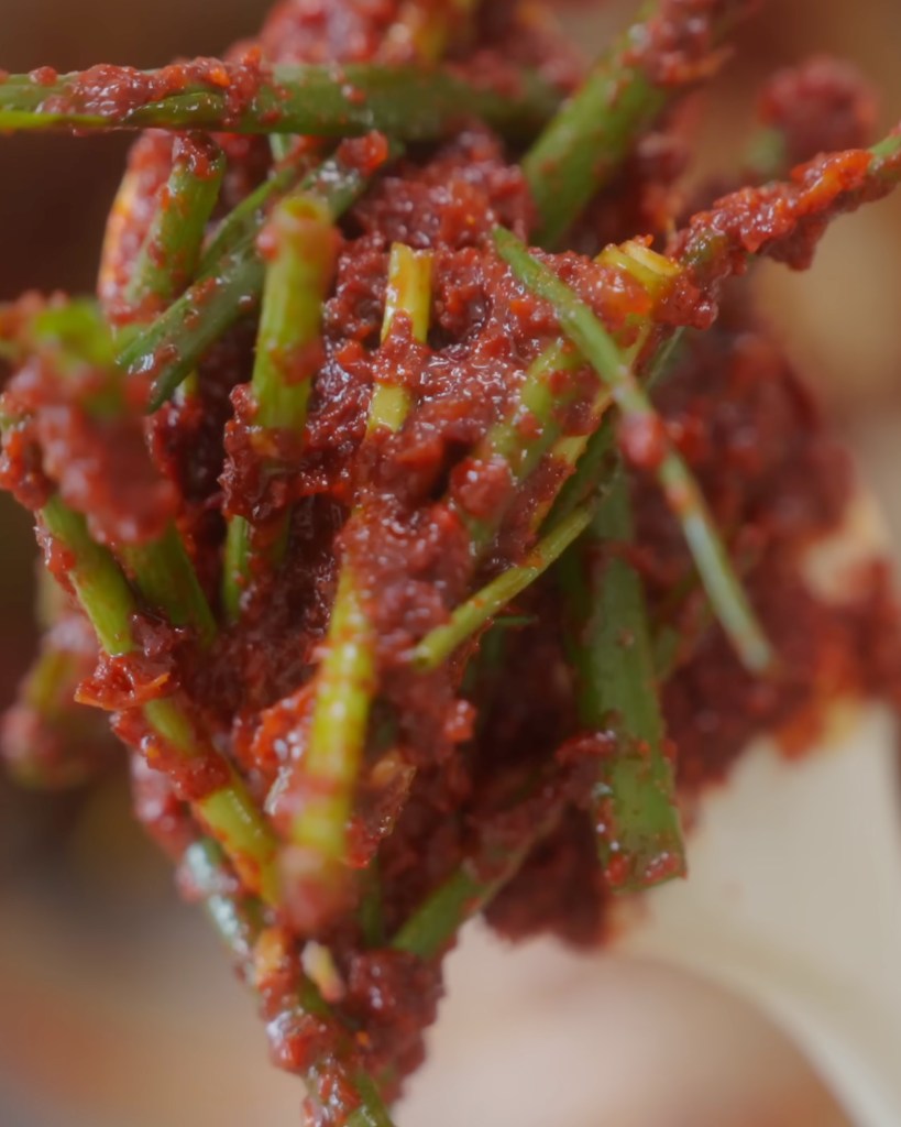 - Add 1/4 cup of the prepared Kimchi Seasoning directly to the bowl with the leeks and fish sauce.
