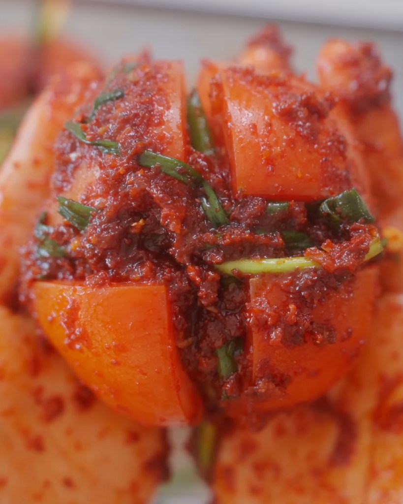 - Carefully apply the prepared Kimchi Seasoning into the cuts and layers of the tomatoes, ensuring an even coating.