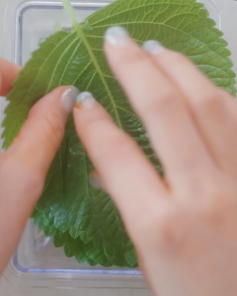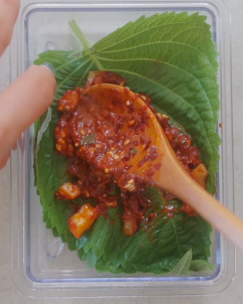 - Take one perilla leaf at a time and spread a thin layer of the prepared kimchi sauce evenly over its surface. Stack the seasoned leaves neatly in an airtight container.