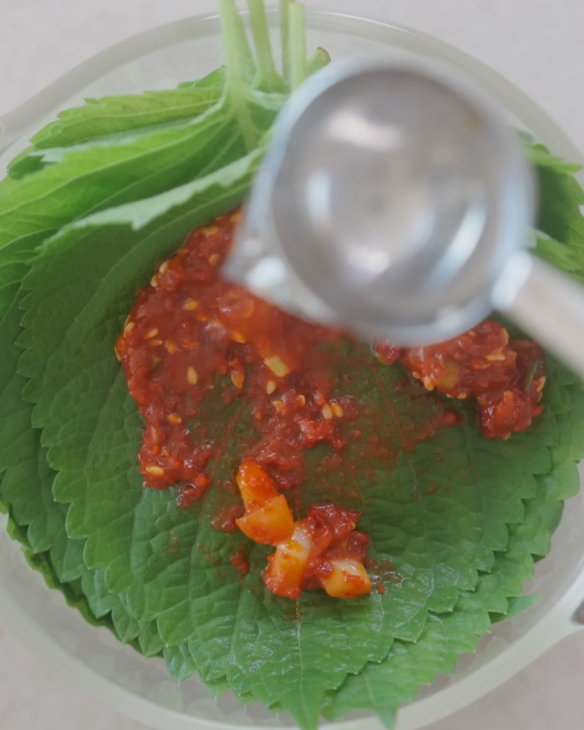 - To this mixture, add minced onion, minced green onion, sesame seeds, and a drizzle of sesame oil. Mix well to create the perilla leaf kimchi sauce.
