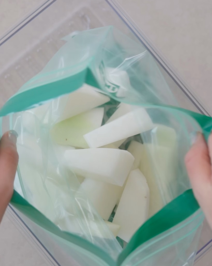 - Place the cut radish in a large plastic bag. Sprinkle with 2 Tbsp salt and gently massage to coat. Let it brine for 20 minutes.