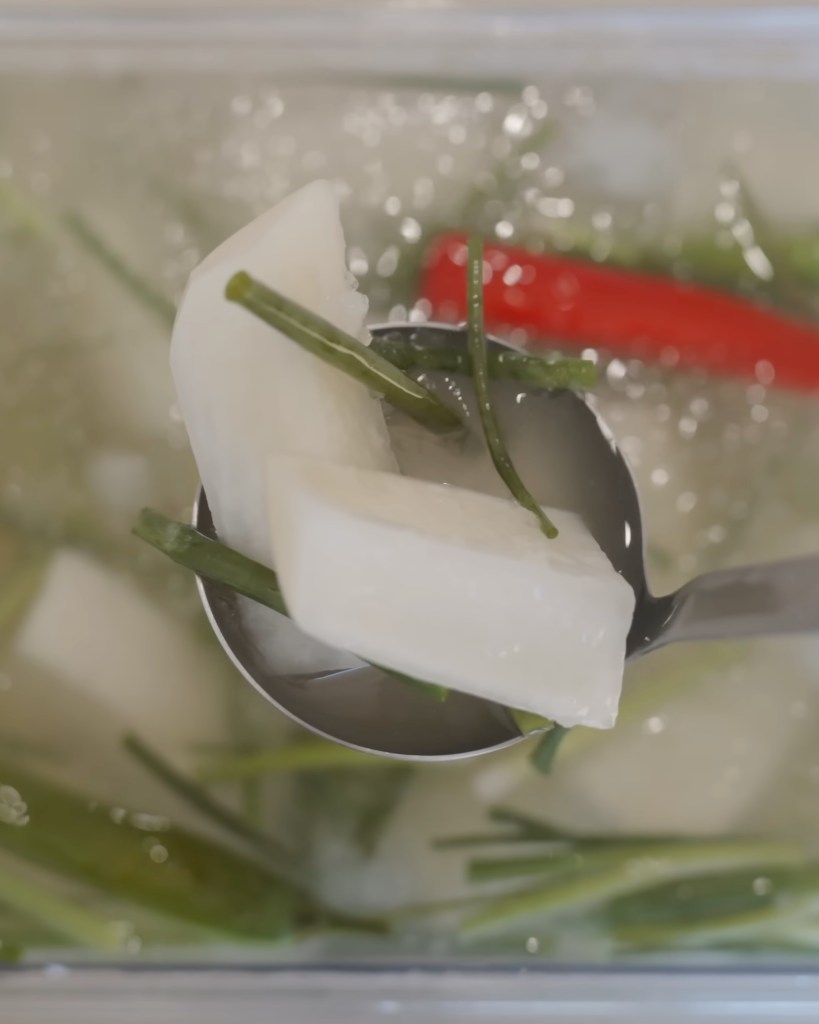 - Add the 5cm-long green onions and the red and green chilies (poked with a fork to release flavor) into the bag with the radish.